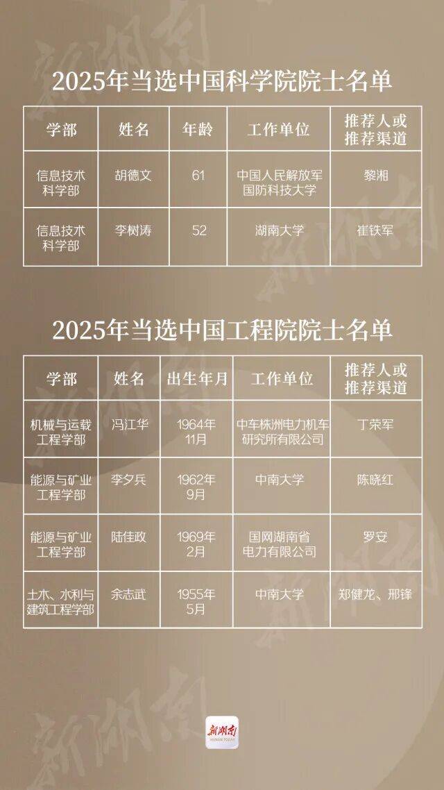 中车株洲电力机车研究所无限公司冯江华、中南大学李夕兵、国网湖南省电力无限公司陆佳政、中南大学余志武被选中国工程院院士。